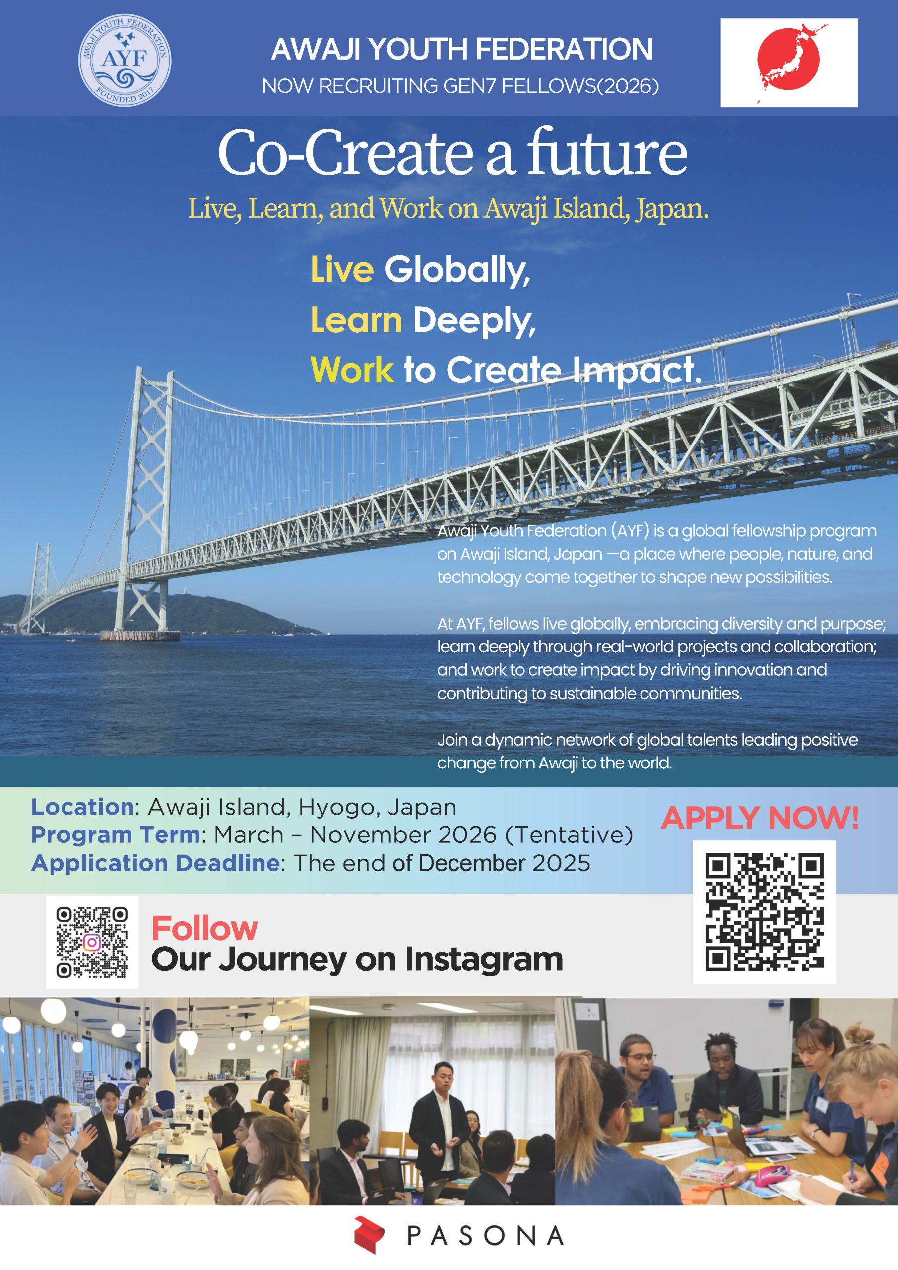 AYF (Awaji Youth Federation) is seeking next generation leaders with the passion to challenge themselves in the unique global community on Awaji Island. If you are interested in joining AYF, please scan the QR code and submit the application form. Don’t miss this chance!