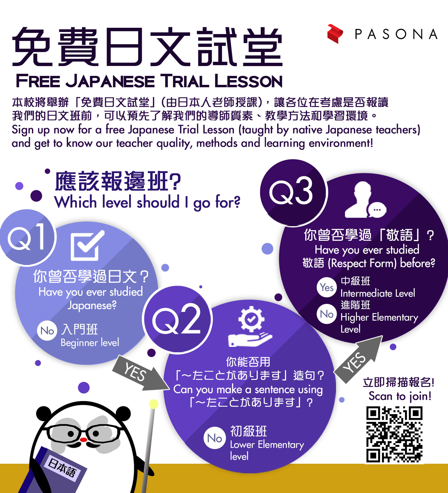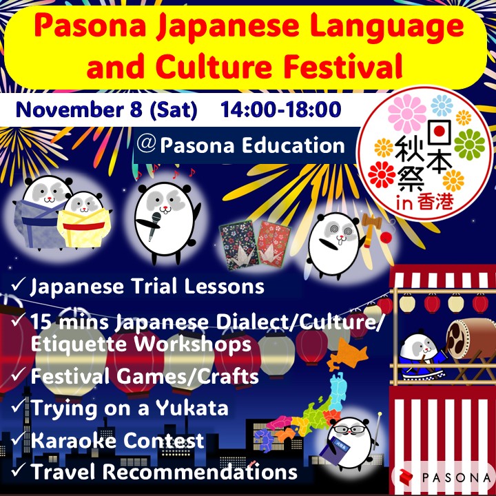 We are happy to announce that we will hold the "Japanese Language and Culture Festival" on November 8. Schedule Date: November 8 (Saturday) Time: 2:00pm-6:00pm Venue: Pasona Education (2/F, Vulcan House, 21-23 Leighton Road, Causeway Bay, HK) Remarks 1. All activities are free of charge. 2. Trial lessons are available for new students. Please [...]