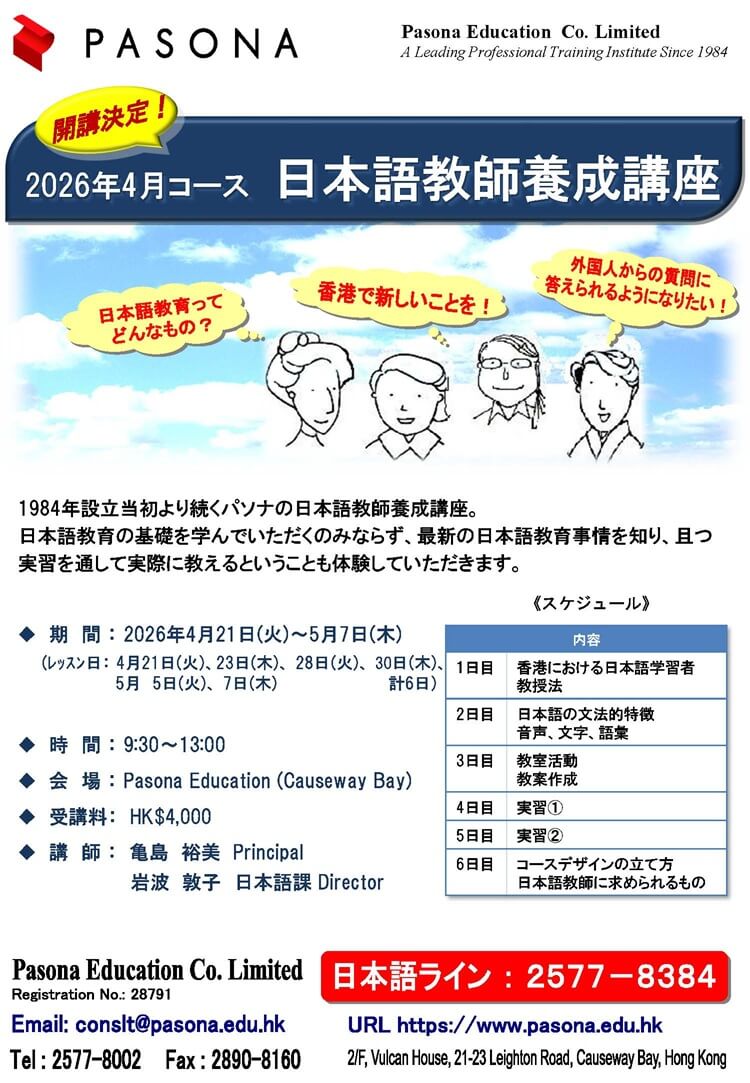 This course includes Japanese language teaching methods and practices with theory. It is suitable for people who are planning to be Japanese language teachers. Date : April 21, 23, 28, 30, May 5, 7 Time : 9:30am-1:00pm Tuition Fee: HK$4,000 * This course is conducted in Japanese. Application Form