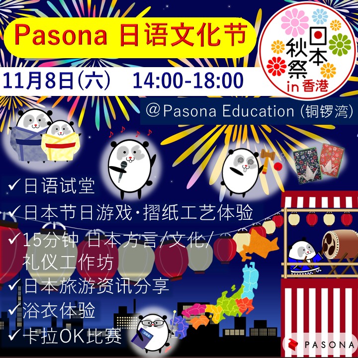 我们将于11月8日举行「日语文化节」。 活动详情 日期:11月8日[星期六] 时间:2:00pm-6:00pm 地点: Pasona Education[铜锣湾礼顿道21-23号均峰商业大厦2楼] 备注 1. 所有活动均费用全免。 2. 日语试堂只限新学员参加,请点击按钮并填写Google Form预约。名额有限,先报先得,额满即止。 3. 15分钟日本方言/文化/礼仪工作坊每场最多可容纳10位参加者,并设有站立区。请亲临本校接待处或致电本校预留座位。 4. 「日本旅游资讯分享」这环节将介绍山口县、德岛县、兵库县、熊本县及宫城县。 5. 礼仪工作坊的主题包括「座位次序」和「交换名片的正确方法」。 6. 日本文化工作坊的主题包括「参观神社的正确方法」和「泡温泉的正确方法」。 报名日语试堂 欢迎大家一起参加,并轻松有趣地学习日本语言和文化!