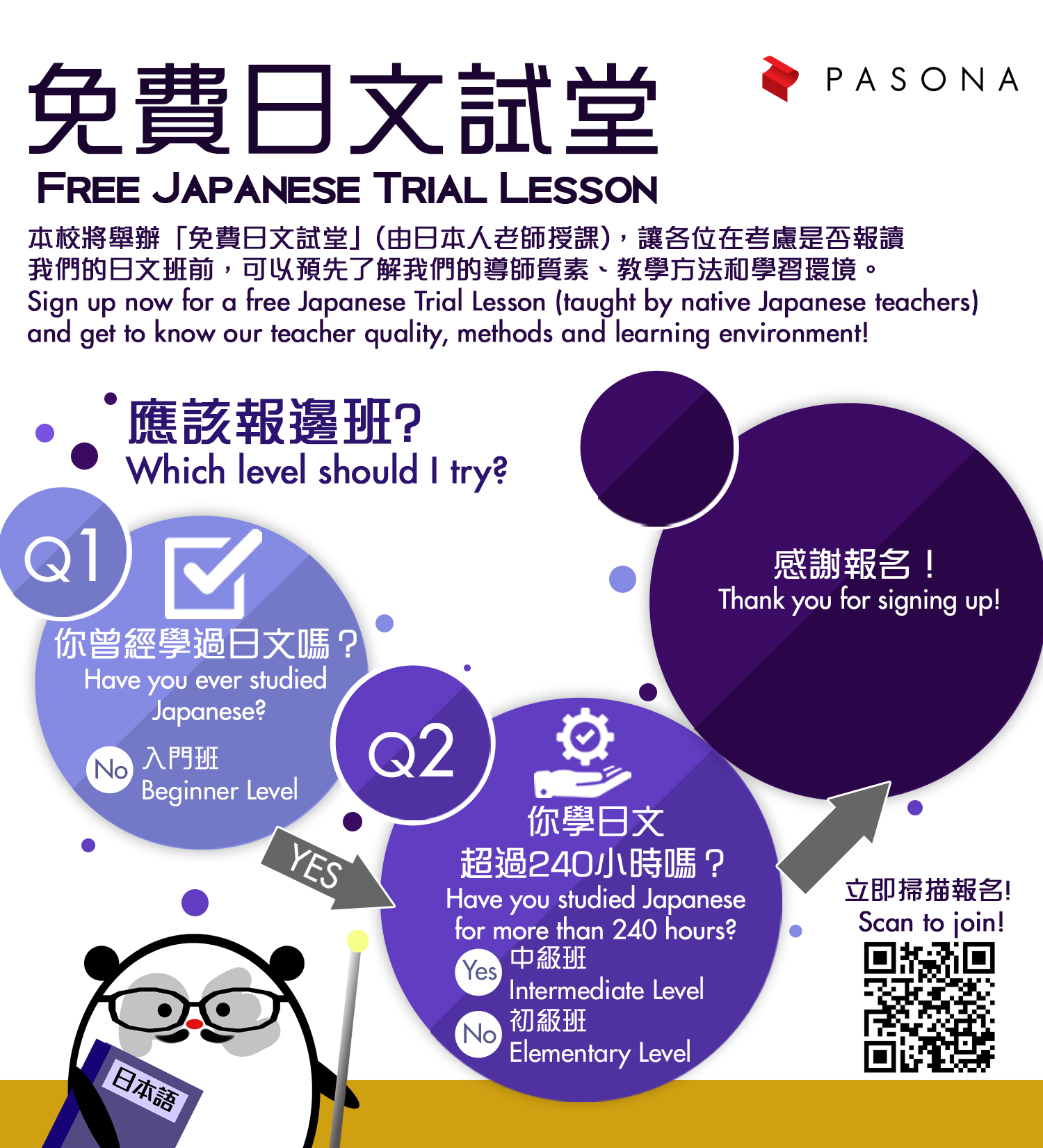 我們將會舉辦「免費日文試堂」﹝由日本人老師授課﹞,讓各位預先了解Pasona的導師質素、教學方法和學習環境!